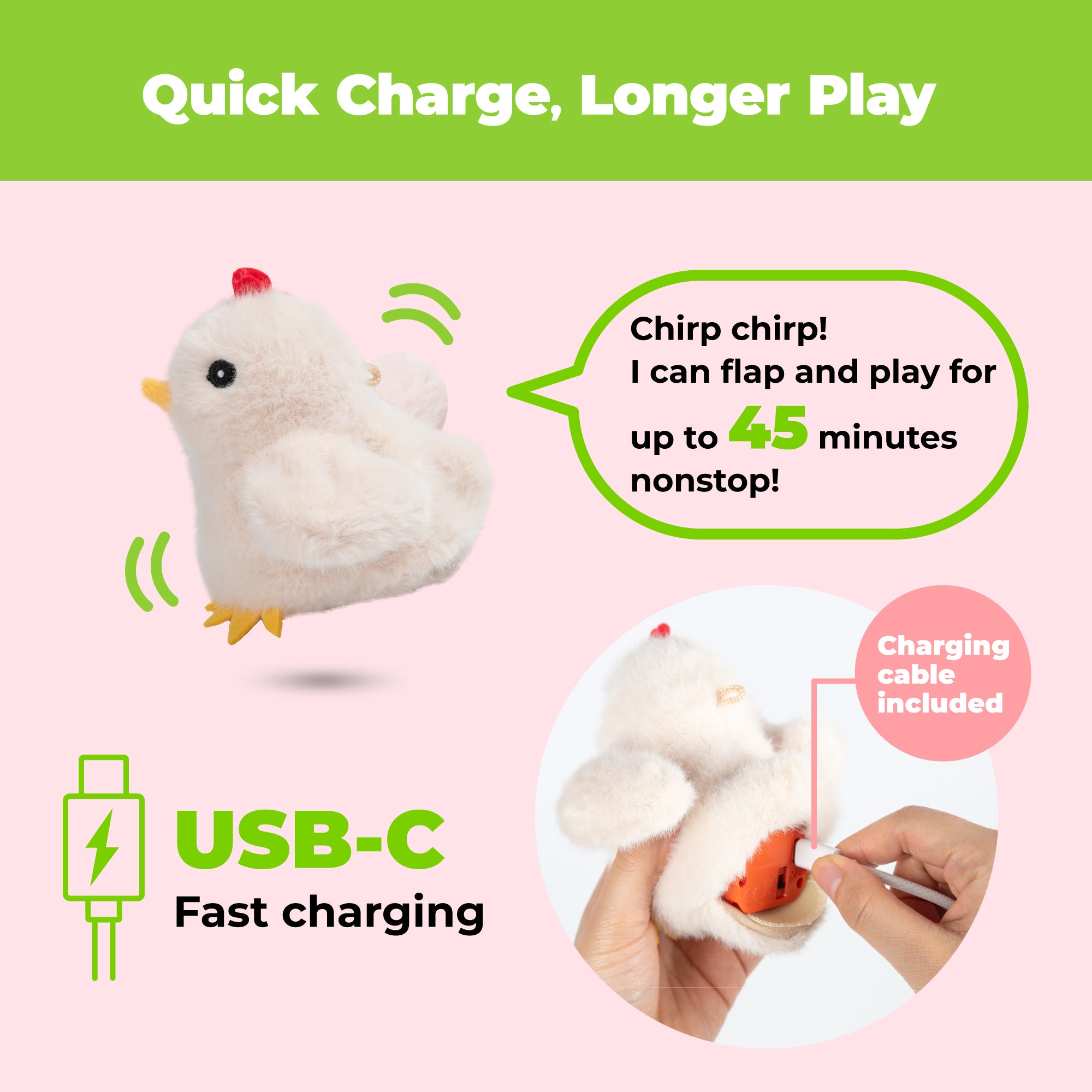 The rechargeable USB-C battery powers up to 45 minutes of non-stop entertainment, with smart auto-sleep between play sessions to stretch battery life. At 6.3" x 5.1" x 4.5", it's the perfect size for kittens and adult cats alike. Give your indoor cat the enrichment and exercise they crave—one flap and chirp at a time.